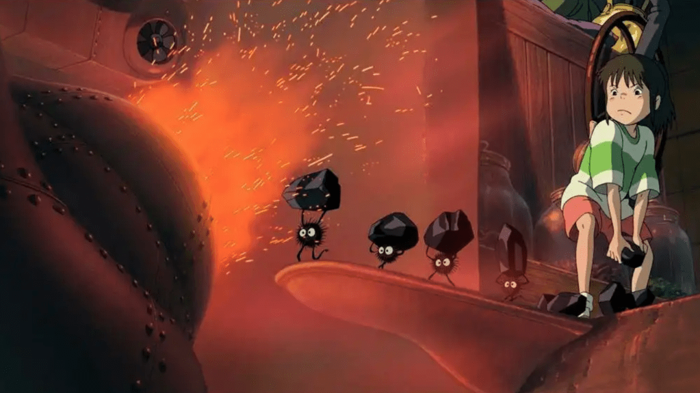 After Haku tells her to find Kamaji, Chihiro makes her way down to the boiler room. Kamaji tells her that he does not need any more help; he has soot sprites to chuck coal into the fires for him. Chihiro picks up a piece of coal anyway, determined to work to earn her freedom. Kamaji notices, and encourages her (however harshly): “Finish what you started.”