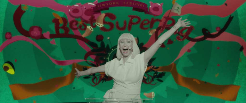 This opening scene is flashy, lively, and energetic. The camera moves in sweeping tracking shots across the factory floor. Lucy — bleach-blonde wig on her head and braces on the top row of her teeth — addresses a crowd of Mirando employees with great pizazz (and some profanity). Her right-hand man watches her from the rafters, mouthing her words along with her. On a screen behind Lucy, graphics and animations visualize the concepts and statistics that she speaks about. Sometimes, these animations take over the full screen so that we can formally process them, too. There are a multitude of competing visuals and a lot of information thrown at us at all once. By the end of the sequence, the overload feels a little unsettling… and the content strikes an odd tone.