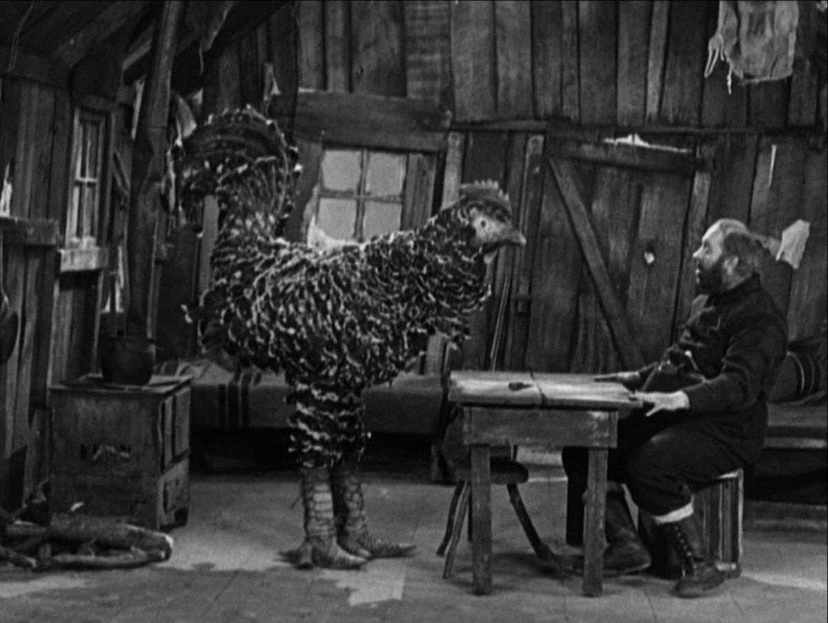 Once the dog and Black Larsen leave the cabin to find food elsewhere, however, the Lone Prospector is left with no choice but to boil his own boot for him and Big Jim to eat. He tries to give Big Jim the sole first, but Big Jim wants the upper leather. They split the shoelaces and eat them as if they were pasta. Jim starts to hallucinate from his hunger pangs — he envisions Chaplin’s character as a massive chicken, and breaks out a rifle to try to shoot him down. A comedic chase ensues.