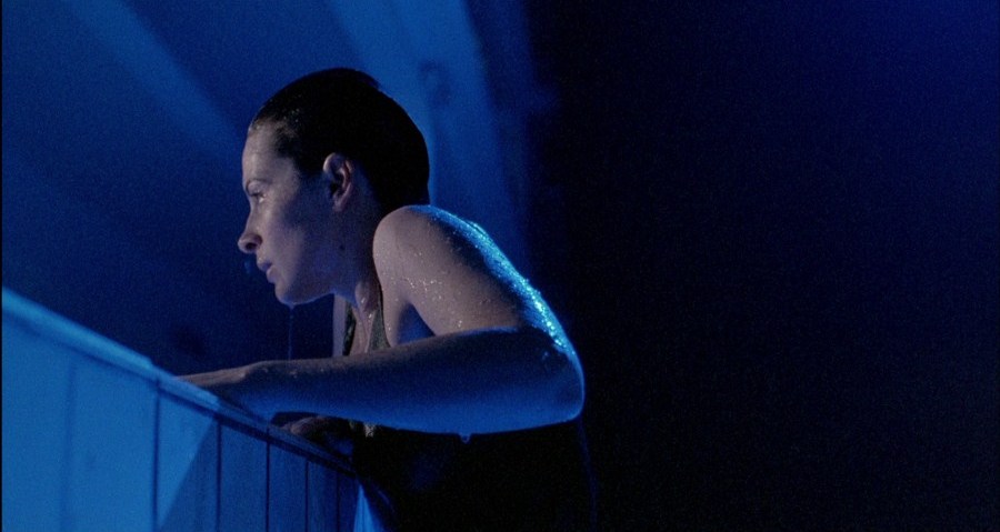 There is also a play in Blue, most obviously, with color, which helps to aesthetically tie all of this together. The color blue is scattered throughout the film’s environments: in the chandelier and candy wrapper and the folder that holds Patrice’s compositions; in the light that reflects on Julie’s face through several different windows, and in the water that washes over her as she repeatedly swims in a pool. In the case of this latter motif, the color directly evokes the notable term drowning in grief. At every turn of Julie’s story, over and over, that same color appears onscreen, both subtle and direct… blue, the hue of sadness.