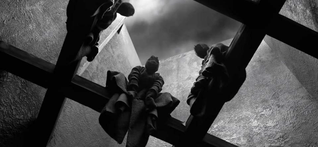 When these sound design and cinematography choices are at their most exaggerated, The Tragedy of Macbeth feels most overtly like a movie as opposed to a filmed version of the play. Though compelling throughout, the film is best when it boldly plays to the unique strengths of its medium… when images and sound overtake the senses, like in the scene in which the witches stare at Macbeth from above and fill the room with a false and unnatural pool of water from which Macbeth hears dark prophecies from a disembodied head. Light and sound and close-up fury are among film’s most powerful tools; translating a play to screen without expanding the story or adapting the play demands that those tools are utilized powerfully if the film is to feel cinematic.