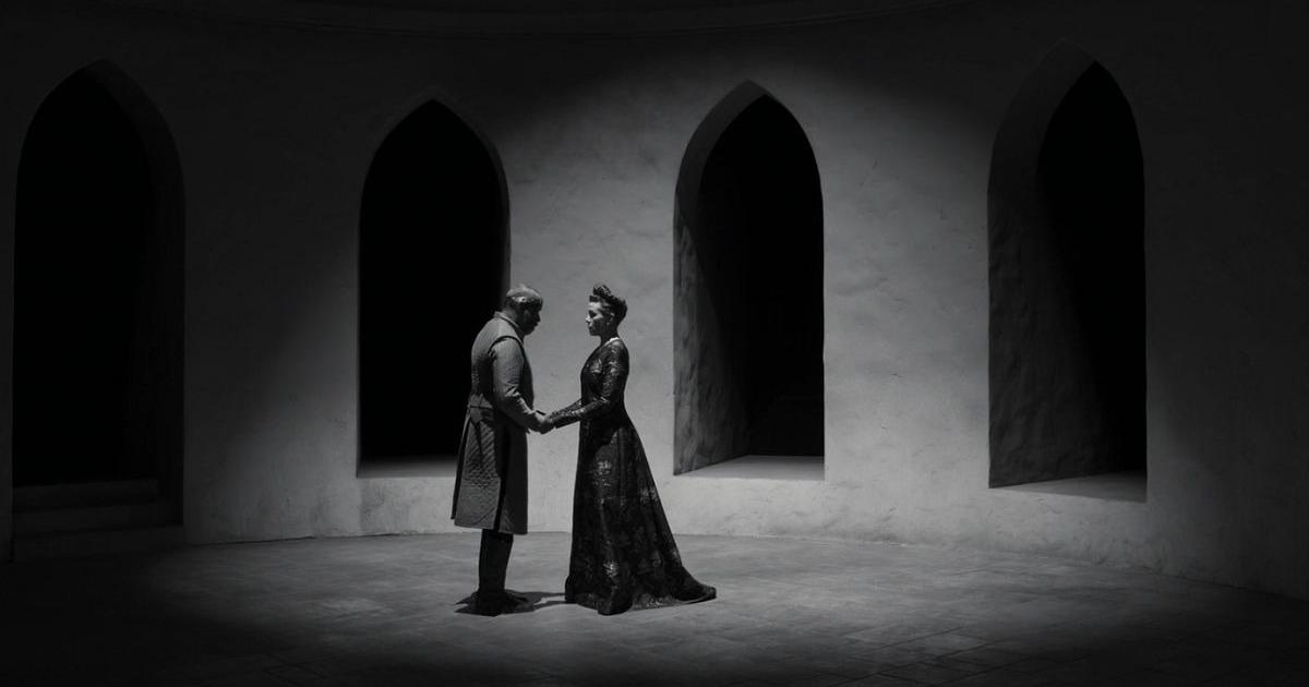 The Tragedy of Macbeth begins with the voices of three witches conversing in hushed tones over a black screen — “When shall we three meet again, in thunder, lightning, or in rain?” “When the hurlyburly’s done; when the battle’s lost and won.” From the film’s opening moment, the focus is on Shakespeare’s words; this remains consistent throughout to the finish of Joel Coen’s adaptation. Though the film cuts from black to a striking cinematic image — blinding white fog that parts to reveal three black crows circling in the sky — it quickly settles into a back-and-forth of medium shots of actors reciting the Bard’s lines directly to camera.
