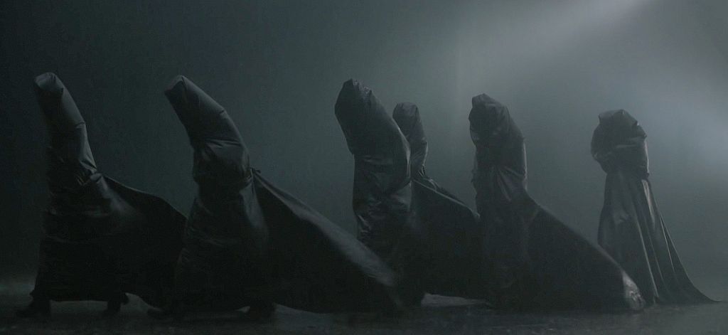 When the Bene Gesserit first arrive on the Atreides’ home planet of Caladan, they emerge from their ship, which resembles the head of a locust, shrouded in black robes. Rain pours down on them in the darkness of night, wind whips their robes erratically behind them, and harsh female whispers chant aggressively on the soundtrack.