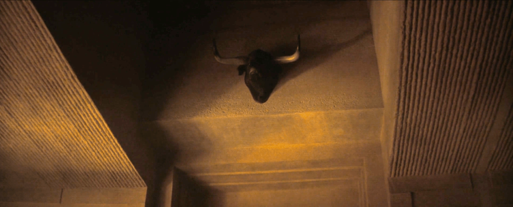 Throughout the film, we see the head of that murderous bull before the scene of Paul’s ‘test’ at the hands of the Reverend Mother, carefully packed up for transit to Arrakis, in the background of the great hall in which the Duke’s wife Lady Jessica selects a housekeeper, and finally high above the room in which the Harkonnens enact the final stage of their coup.
