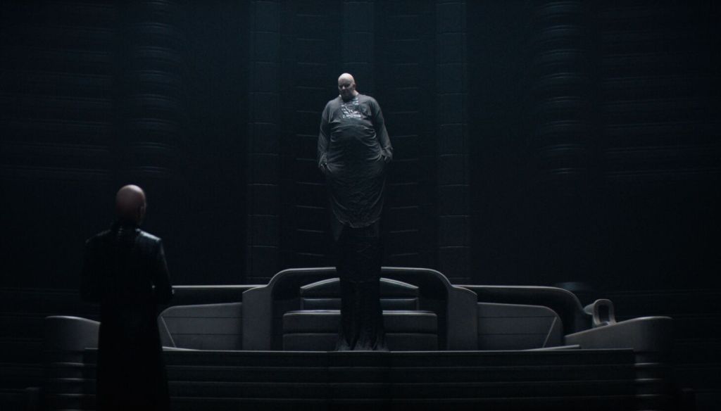 We first meet the leader of their oppressors, the Baron Vladimir Hakonnen, a few scenes later. His introduction is prefaced by a statement in a training session in which the Atreides House Warmaster Gurney spits at Paul, “You haven’t met Harkonnens before. I have. They’re not human; they’re brutal.” This sentiment sets our expectations for who the Harkonnens are, and then immediately after, we see their dark, ominous, futuristic home world, Geidi Prime, accompanied by musical score that sounds like a blend of strings wailing and industrial machines pulsing. The Baron himself is a massive lump of a man, pale and fat and shrouded in fog. His look and his voice — deep, commanding, drawling — are both unnerving. He rubs his sweating, bald head with his hand; his behavior in this scene harkens back to Marlon Brando’s performance as the unpredictable, violent recluse Colonel Kurtz in Apocalypse Now. The pop culture reference is a subconscious indicator to us that the Baron is an unhinged leader.