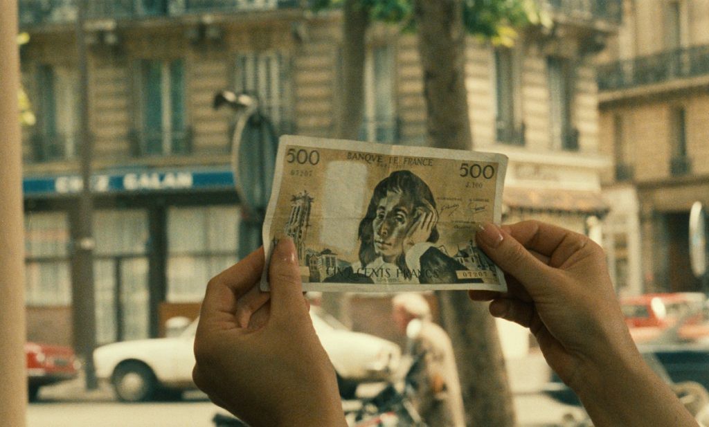 Norbert turns to a friend for extra money… and the friend gives him a perfectly counterfeit 500 franc bill. The boys put on their jackets and exit the room to spend it. Before the door closes, Bresson cuts to a shot outside of a shop in the streets of Paris; the boys roll up to the sidewalk on their motorbikes, park them, and enter the store. Norbert’s friend drolly convinces the cashier that the counterfeit bill is real. “No question about it.”