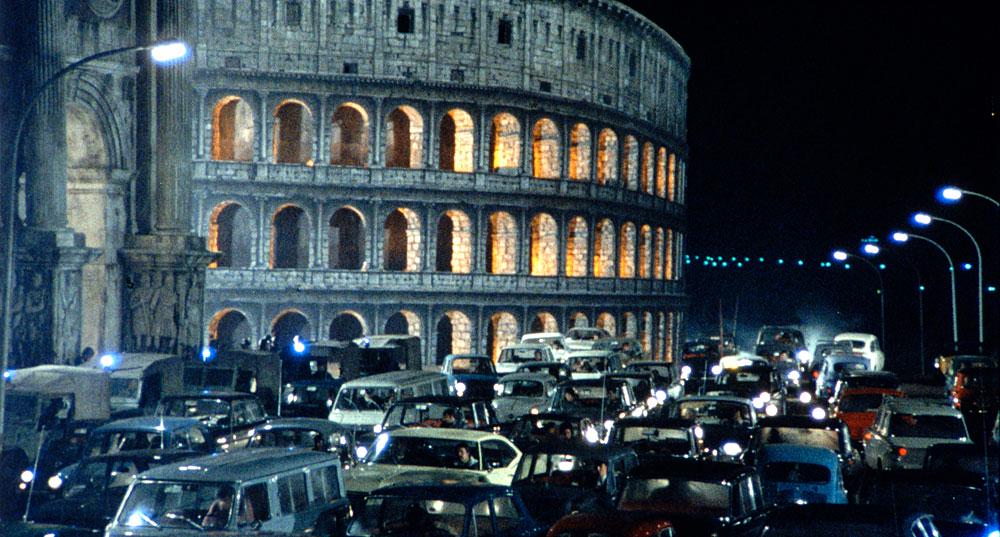 Another captivating, visceral sequence about modernity and history intertwining also involves vehicles, and takes place on the Grande Raccordo Anulare, the circular highway surrounding Rome. That scene starts off innocuously enough, with a wide shot of cars driving through toll gates in the middle of the day. But Fellini rapidly devolves the scene into a chaotic montage. Rain pours down from the sky. Fires burn on the side of the road. A white horse trots between lanes of traffic. Men yell at each other out of their car windows. Hippies and prostitutes stare into the camera from small hills on the side of the highway. Fellini places himself — and a film crew — on a crane in the middle of the traffic, and films himself and his team filming all of this surreally staged chaos. Military tanks, hitchhikers, smokestacks, a dead cow, and barking dogs are among the many things that Fellini’s camera captures before he ends the sequence with a wide shot of gridlocked traffic, and a slow zoom into the looming Colosseum behind it, while horns honk loudly and angrily on the soundtrack.