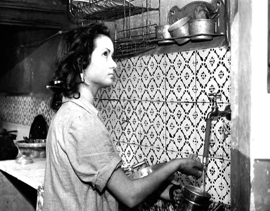 There is a scene about a third of the way through the film in which the young housemaid lights a fire on the stove by flicking a match against the dirty, sloppily-painted wall behind her. The paint in that area of the wall has been completely removed in several streaks — no one has bothered to hide the match strokes with clean paint. De Sica then cuts to a shot outside, where he dollies toward the broken doors of the kitchen balcony, past hanging laundry, and settles on a close-up of the housemaid joylessly staring out of the dirty windows toward the back alley. He cuts to her point-of-view shot; we see dozens of similar balconies and a cat walking across a tin roof. She wordlessly meanders back into the kitchen after a beat, and begins to fill a kettle with water. She glances up at the ceiling, and — judging by the angry look on her face and her flick of the water spout — she sees ants. De Sica lingers on a close-up of her for a moment as tears well in her eyes. But he doesn’t dwell on this, nor make the scene sentimental. Instead, she sits down and begins to grind coffee. Her hopelessness is not drama, but fact, and she must do what she has to to survive.
