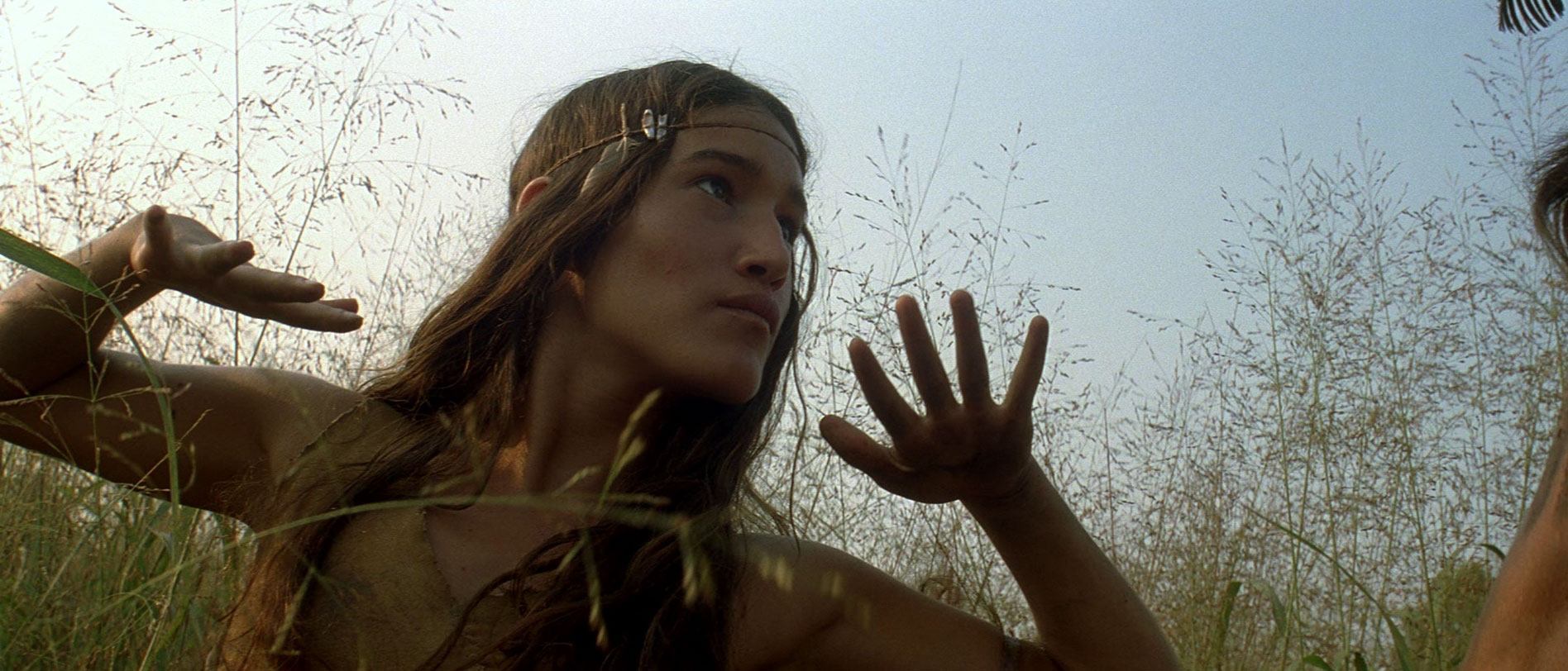 The montages in The New World, by contrast, highlight nature’s beauty: water rushes through rocks in a stream, a bird flies through the sky, sunbursts cut through the trees and flare up the camera’s lens. Grass sways in the wind.