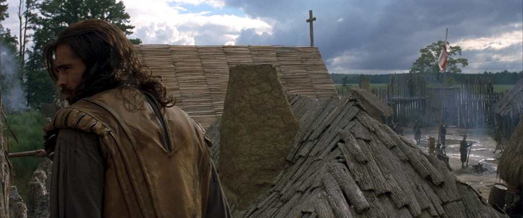In this film about a conflict between peoples, the Powhatan tribe is on the side of beauty and peace, and their village is aesthetically integrated into the natural world around it as such. Its wigwams are interspersed between tall trees; its grounds are covered in grass. Their society has no firm borders — it extends into the nearby water and out into the surrounding fields alike.